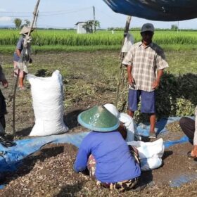 Blora/lingkaralam.com.Kapolsek Kedungtuban Polres Blora Polda Jawa Tengah AKP Sujiharno bersama anggotanya menyambangi warga yang sedang panen kacang kulit di kawasan persawahan desa Wado, Jumat, (20/01/2023).