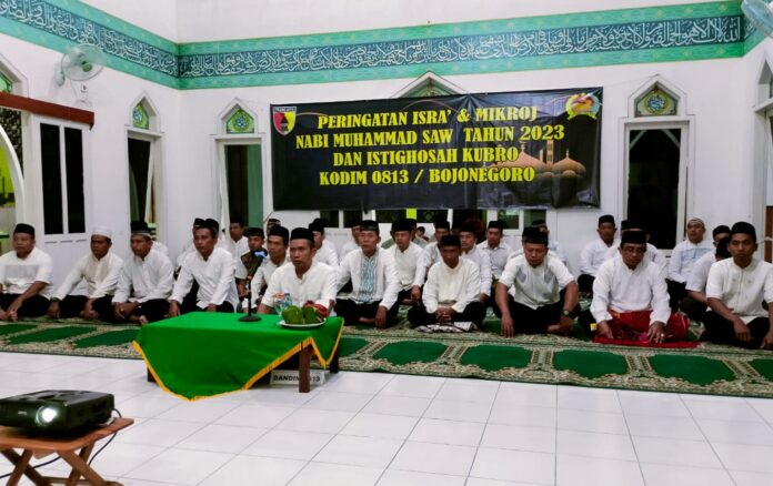 Lingkarralam.com|Bojonegoiro– Dalam rangka memperingati hari besar Islam Isra Mi’raj Nabi Muhammad SAW 1444 Hijriyah, anggota TNI jajaran Kodim 0813 Bojonegoro turut mengikuti kegiatan Istighosah Kubro secara virtual di Masjid Al Askhar Markas Kodim setempat, Minggu (19/2/2023).