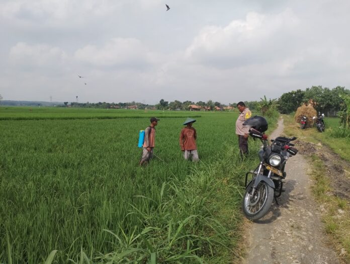 Lingkaralam.com,Blora-Bhabinkamtibmas Desa Gabusan Polsek Jati Polres Blora Polda Jawa Tengah Aipda Suyono melakukan kegiatan sambang desa dengan mendatangi para petani yang sedang menggarap sawah di dukuh Balungkal, Kamis, (16/03/2023).