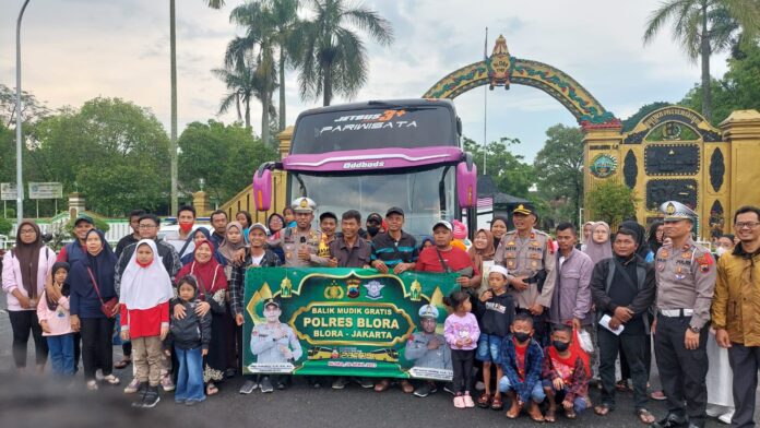 Lingkaralam.com,Blora-Kapolres Blora AKBP Fahrurozi, S.I.K., M.M., M.H. yang diwakili Kompol Sudarto Kasat Binmas didampingi oleh Kasat Lantas Polres Blora AKP Noach Hendrik, S.I.K., M.A memberangkatkan peserta balik mudik gratis jurusan Blora-Jakarta di depan Pendopo rumah dinas Bupati Blora, Jumat, (28 /04/2023).