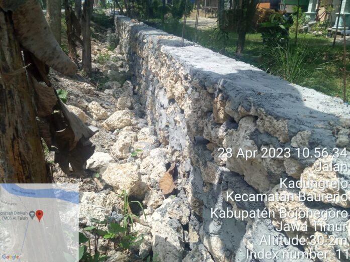 Lingkaralam.com,Bojonegoro-Dilihat secara kasat mata pekerjaan proyek TPT (Tembok Penahan Tanah) di Desa Kadungrejo Kecamatan Baureno Kabupaten Bojonegoro,yang menyedot Dana Desa (DD) tahun 2023.Terkesan asal asalan.