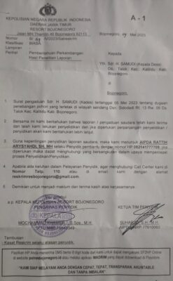 “Atas dasar protes warga yang menuntut agar permasalahan ini diselesaikan di aparat penegak hukum, maka kita menindaklanjutinya dengan melakukan pengaduan kejadian pengerusakan ini ke Polres Bojonegoro tertanggal 5 Mei 2023,” kata Sumadi.