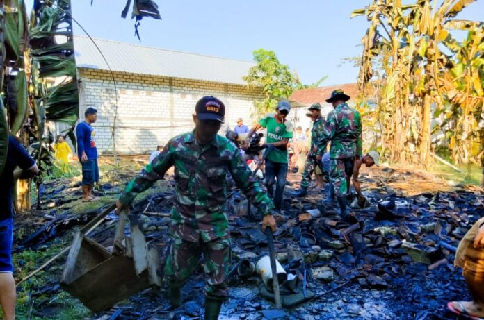 Lingkaralam.com,Bojonegoro– Bintara Pembina Desa (Babinsa) jajaran Koramil 10/Kanor, Kodim 0813 Bojonegoro, pagi ini Senin (22/5/2023), melaksanakan karya bakti bersama masyarakat membantu membersihkan puing-puing sisa kebakaran rumah milik Mbah Kamah (70) warga Dusun Soko RT. 001/RW. 002 Desa Bungur, Kecamatan Kanor yang ludes terbakar pada Minggu (21/5/2023) sekira pukul 16.30WIB.