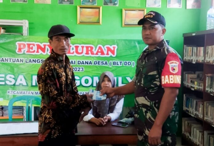 BOJONEGORO, – Bintara Pembina Desa (Babinsa) Posramil 15/Margomulyo Kodim 0813 Bojonegoro, Sertu Sofi’i, melaksanakan pendampingan kegiatan penyaluran Bantuan Langsung Tunai Dana Desa (BLT DD) Tahap II tahun 2023 di Gedung Perpustakaan Desa (Perpusdes) Margomulyo, Kecamatan Margomulyo, Kabupaten Bojonegoro.