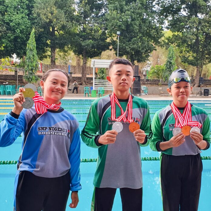 BOJONEGORO– Dalam kejuaraan Bupati Cup tahun 2023 ini, di Cabang Olahraga (Cabor) Renang, SMP Negeri 3 Bojonegoro, meraih 8 Medali. Ke 8 Medali dari Cabor renang tersebut yaitu dari gaya bebas 100 meter putri 1 medali, gaya bebas 50 meter putri 2 medali, gaya kupu kupu putri 2 medali, gaya dada putri 1 medali, serta 2 medali masing-masing renang gaya bebas 50 meter dan gaya dada 50 meter putra.