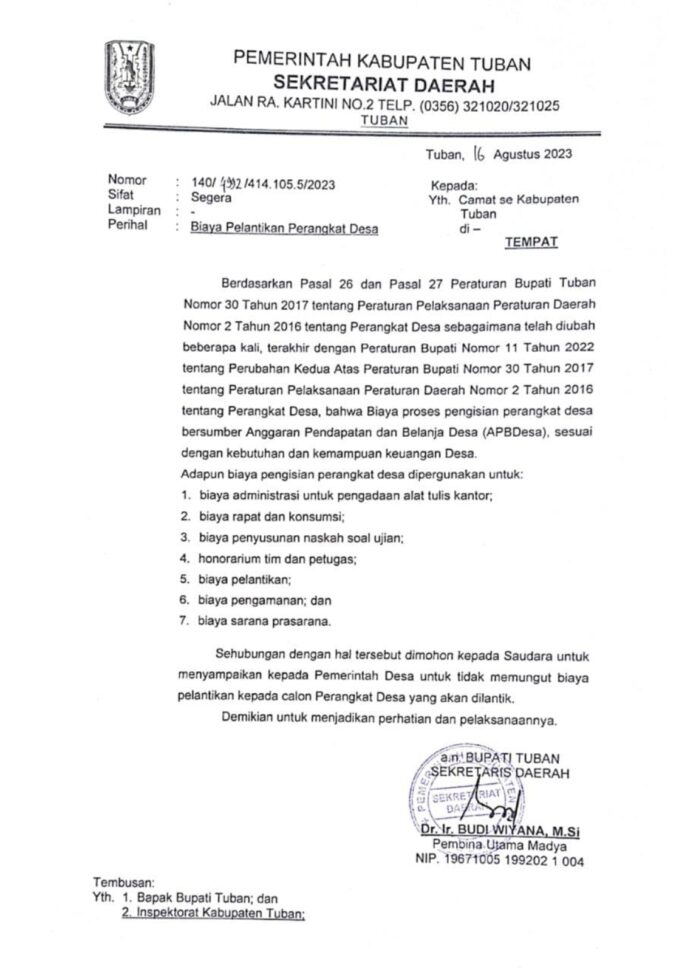 Padahal, Pemerintah Kabupaten Tuban, melalui Surat Edaran yang ditanda tangani oleh Sekretaris Daerah (Sekda), Nomor 140/4992/414.105/2023 yang disampaikan kepada seluruh Camat sejak Rabu, (16/08/2023) menjelaskan bahwa seluruh biaya pelantikan, di anggarkan melalui APBDes.