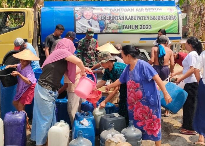 BOJONEGORO, – Bintara Pembina Desa (Babinsa) Koramil 0813-08/Kedungadem, Pelda Sugito, turut membantu mengawal berlangsungnya penyaluran bantuan air bersih dari Pemkab Bojonegoro melalui Badan Penanggulangan Bencana Daerah (BPBD) di Dusun Takolan Desa Kendung Kecamatan Kedungadem.