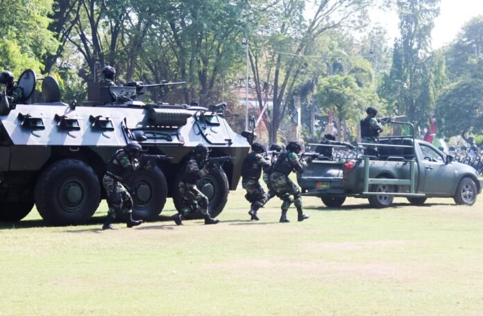 BOJONEGORO, – Rangkaian kegiatan dalam rangka memperingati Hari Ulang Tahun (HUT) Tentara Nasional Indonesia (TNI) ke- 78 pada Kamis (Zainuddin05/10/2023) pagi, di Alun-alun Pemerintah Kabupaten Bojonegoro berlangsung sangat meriah. Pasalnya, dalam acara itu terjadi drama pembebasan sandera yang dilakukan oleh prajurit Kodim 0813 Bojonegoro.
