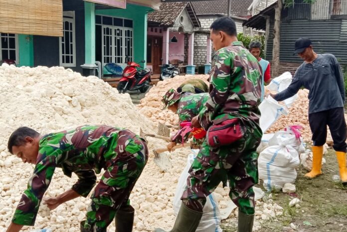 Dalam kegiatan karya bakti tersebut, anggota Koramil 0813-10/Kanor bersama masyarakat bahu-membahu menebalkan tanggul Sungai Merkuris dengan menggunakan karung berisi batu kapur putih atau pedel.