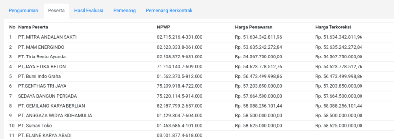 Lelang proyek pengadaan jasa konstruksi pembangunan Gedung IPIT RSUD dr. R. Koesma Tuban diikuti oleh beberapa rekanan kontraktor sebagai penawar lelang. PT. Anggaza Widya Ridhamulia Sebagai pemenang lelang dalam proyek ini merupakan penawar lelang peringkat 9 dari 10 peserta lelang yang mengajukan penawaran.
