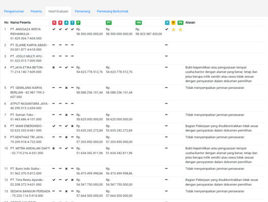 PT. Lancarjaya Karya Abadi dengan penawaran. Rp. 16.720.000.000 gugur dengan dalih tidak memenuhi persyaratan administrasi dalam Daftar isian personil manajerial yang tidak sesuai dengan dokumen pemilihan.