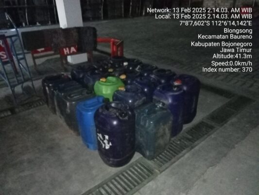 Penyalah gunaan BBM bersubsidi juga terdapat di SPBU Desa Blongsong Kecamatan Baureno, Kabupaten Bojonegoro. Tampak di area lokasi SPBU ada sejumlah 17 jeriken warna biru jenis pertalite.