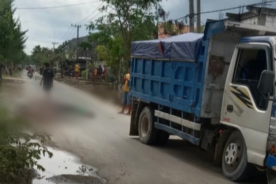 Seorang pengendara sepeda motor berjenis kelamin laki-laki, usia paruh baya, meninggal dunia di lokasi kejadian setelah terlindas truk bermuatan pasir silika.