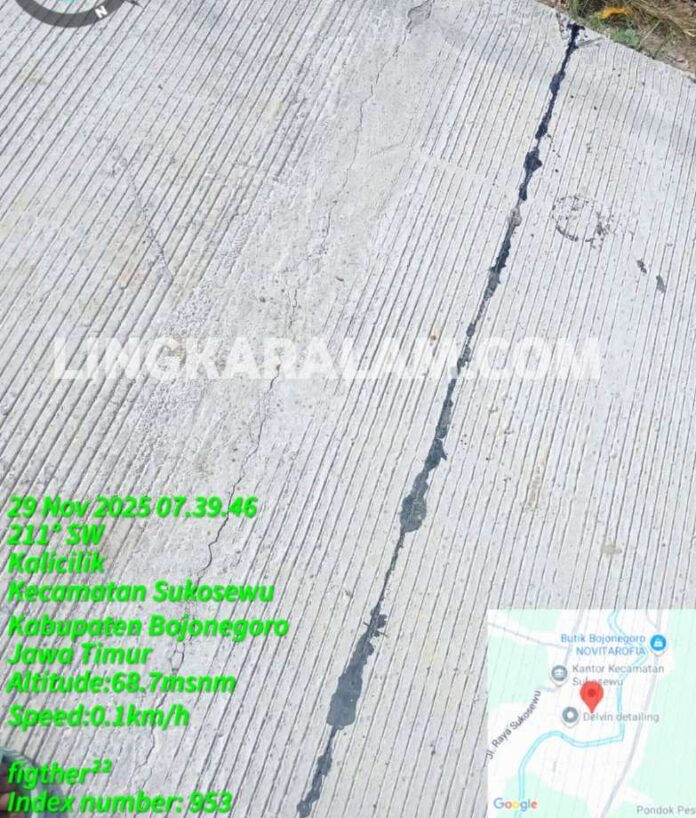 Bojonegoro, Lingkaralam.com — Mutu pekerjaan proyek Rekonstruksi Jalan Sukosewu–Klepek di Kecamatan Sukosewu, Kanupaten Bojonegoro menjadi sorotan publik. Hal ini menyusul ditemukannya retakan parah yang memanjang pada lapisan rigid beton yang bahkan belum dibuka untuk lalu lintas kendaraan secara penuh.