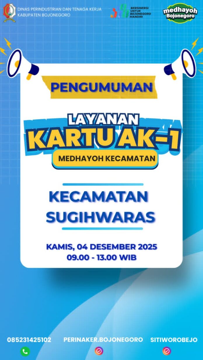 Bojonegoro, Lingkaralam.com – Dinas Perindustrian dan Tenaga Kerja (Perinaker) Kabupaten Bojonegoro kembali menghadirkan terobosan layanan publik melalui program Layanan Kartu AK-1 Medhayoh Kecamatan, sebagai upaya mempercepat dan mempermudah masyarakat dalam mengurus kartu tanda pencari kerja (AK-1).