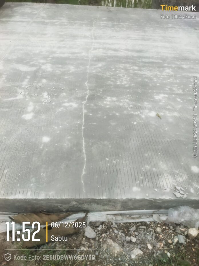Sejumlah retakan terlihat jelas secara kasat mata di permukaan beton. Beberapa bagian bahkan terlihat seperti mengalami tambalan menggunakan material pedel. Kondisi tersebut mengindikasikan dugaan pengerjaan yang kurang maksimal, baik pada proses pengecoran, pemadatan, hingga tahapan curing.