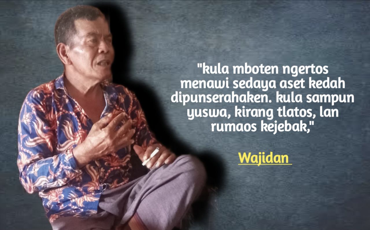 “kula mboten ngertos menawi sedaya aset kedah dipunserahaken. kula sampun yuswa, kirang tlatos, lan rumaos kejebak,” Saya tidak tahu kalau semua aset harus diserahkan. Saya sudah tua, kurang teliti, dan merasa terjebak,” ujar Wajidan lirih saat ditemui, dengan mata berkaca-kaca, Minggu (14/12/2025).