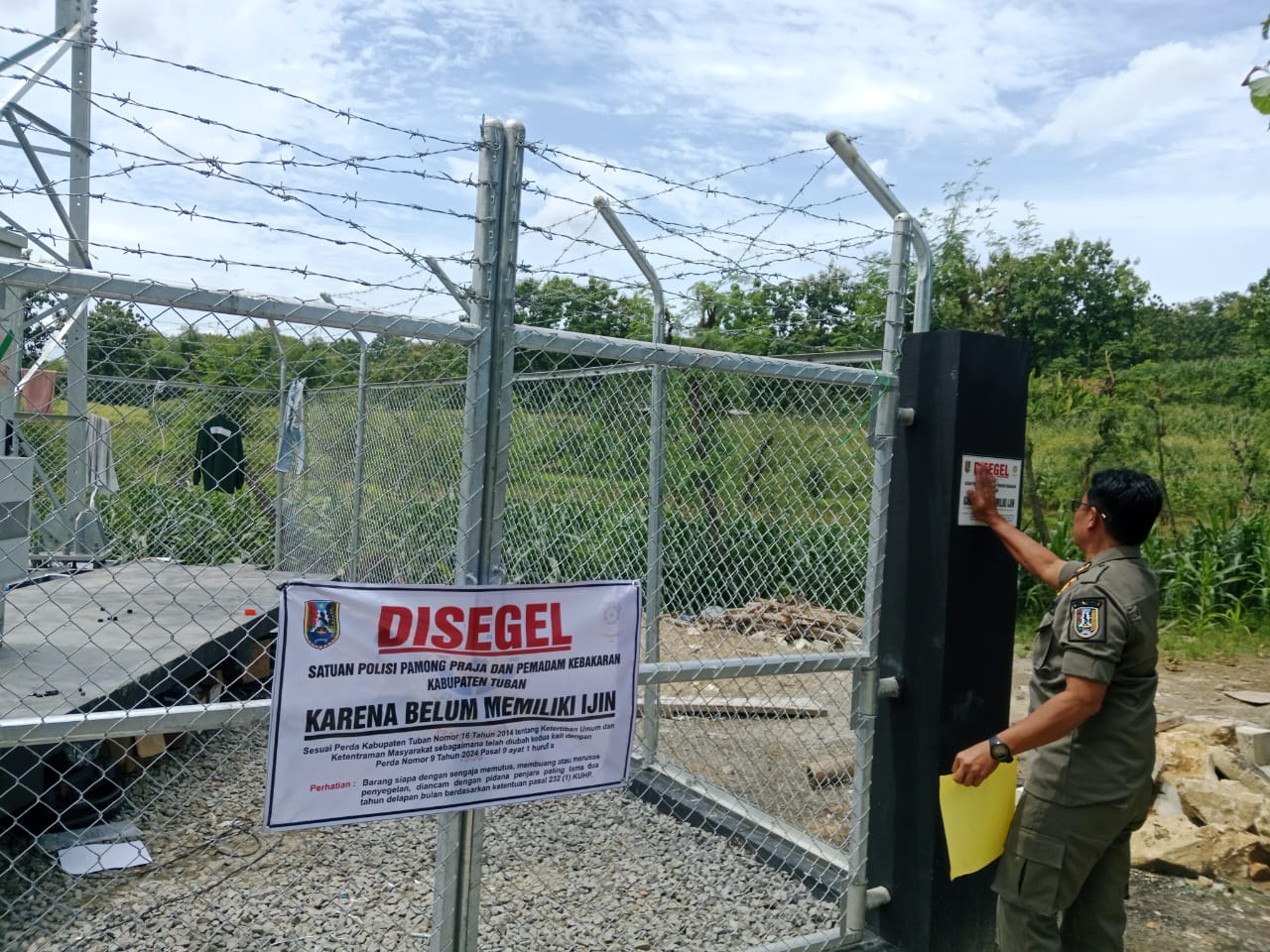 Plakat segel yang dipasang Satpol PP Kabupaten Tuban bertuliskan, “Operasional kegiatan/usaha tower dihentikan sementara karena belum dilengkapi perizinan yang dipersyaratkan dalam Peraturan Bupati Tuban.”