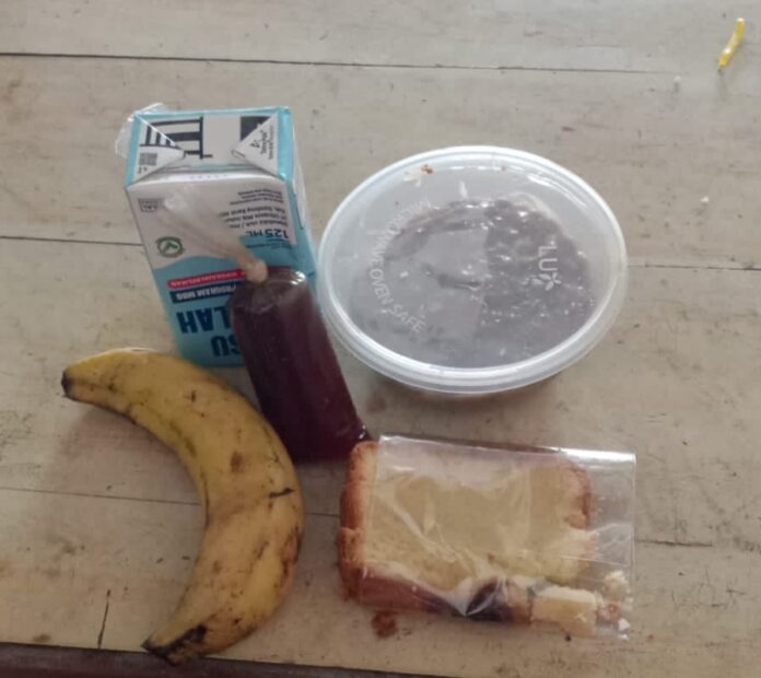Paket menu yang diterima siswa terdiri dari satu buah pisang, sepotong roti kemasan, susu kotak, bubur dalam wadah plastik, serta sirup dalam plastik kecil. Menu tersebut disebut merupakan kombinasi produk home industri dan produk pabrikan.