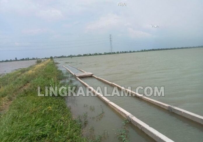 Selain itu, lokasi proyek juga terlihat berada di kawasan yang kerap tergenang air saat musim hujan. Genangan bahkan tampak mengelilingi area saluran dan sebagian lahan persawahan di sekitarnya.