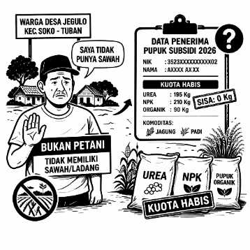 TUBAN, Lingkaralam.com – Dugaan persoalan dalam penyaluran pupuk bersubsidi kembali mencuat di Desa Jegulo, Kecamatan Soko, Kabupaten Tuban. Seorang warga yang disebut tidak memiliki sawah maupun lahan pertanian, justru tercatat dalam sistem sebagai penerima pupuk subsidi tahun 2026 dengan kuota yang dinyatakan habis seluruhnya.