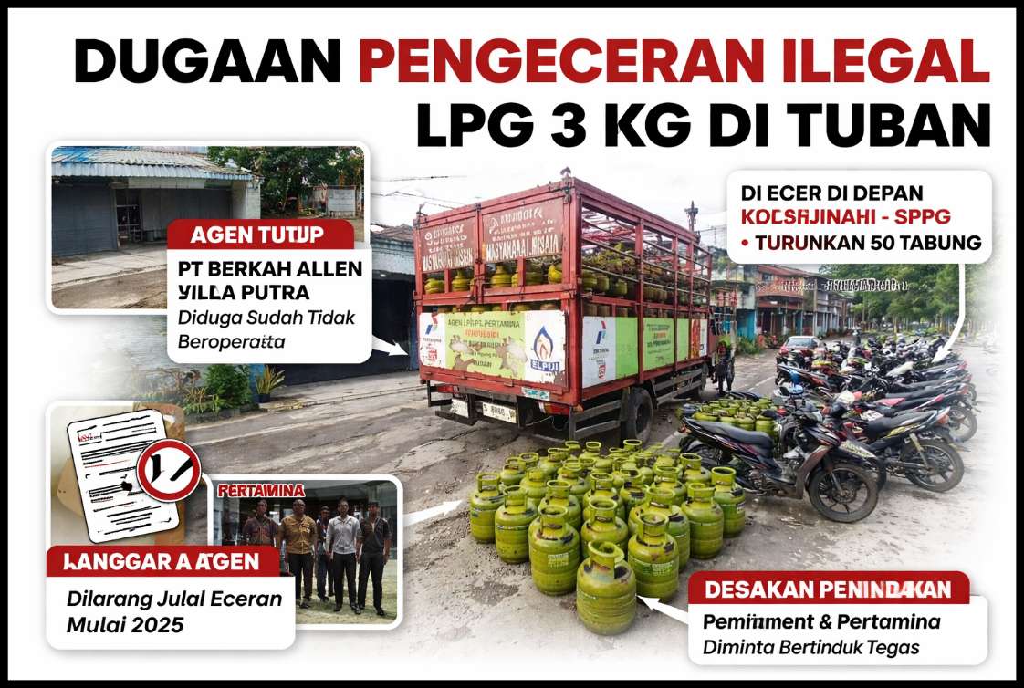 TUBAN, Lingkaralam.com – Di tengah kelangkaan LPG 3 kilogram (gas melon) yang masih terjadi, temuan di lapangan menunjukkan adanya dugaan penyimpangan distribusi yang justru berpotensi memperparah kondisi. Selain indikasi penyaluran tidak sesuai mekanisme, status operasional agen penyalur juga kini menjadi sorotan.