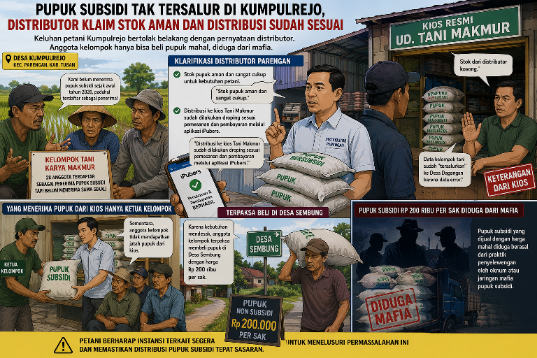 TUBAN, Lingkaralam.com – Polemik distribusi pupuk subsidi di Desa Kumpulrejo, Kecamatan Parengan, Kabupaten Tuban, semakin menimbulkan tanda tanya. Di tengah klaim distributor bahwa stok aman dan distribusi berjalan sesuai prosedur, anggota kelompok tani justru mengaku tidak pernah menerima pupuk subsidi secara langsung dari kios penyalur.